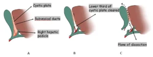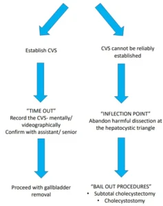 In acute cholecystitis, the gallbladder—and the cystic plate with it—often becomes shortened, with poorly defined borders. This results in distortion and obscuring of the hepatocystic triangle. The Critical View of Safety is only one element of COSIC (Culture of Safety in Cholecystectomy); having a dependable bailout strategy is equally essential. When the CVS cannot be safely obtained, a subtotal cholecystectomy is the most reliable bailout option.