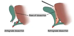Although the gallbladder is typically separated from the cystic plate in an antegrade manner, it may also be removed retrograde. Because the cystic artery is not ligated before this dissection, increased bleeding from the gallbladder bed is common. A small portion of peritoneum or gallbladder wall is intentionally left at the fundus to facilitate liver retraction.