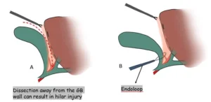 A. Caution must be employed to stay on the wall of the gallbladder. Any deviation from this plain can result in injury to the hilar structures.