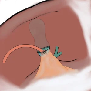The mucosal surface of the gallbladder remnant is cauterized, and a drain is placed at the infundibulum just above the cystic duct, exiting through the laparoscopic port site. The main drawback of this approach is a higher risk of postoperative bile leakage; however, these fistulas usually resolve spontaneously and this method remains safer than risking a bile duct injury.