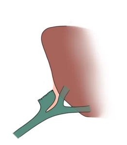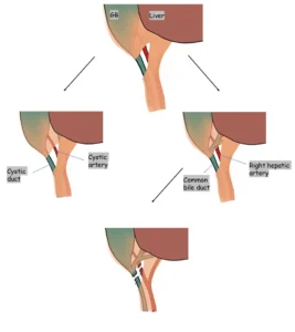 The illustration highlights the alignment of the bile ducts as they enter the liver and their relationship to key anatomical landmarks. This spatial orientation helps surgeons understand safe dissection planes, avoid low or misdirected dissection, and maintain proper awareness of critical structures during cholecystectomy.