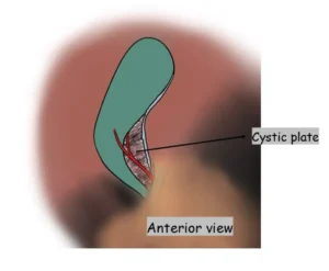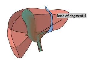 Anteriorly, the base of the quadrate lobe (segment IV) serves as an important landmark, marking the level of the hilar plate. This reference point helps guide safe dissection and maintain correct orientation during cholecystectomy.