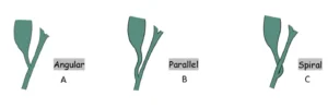 A. Most commonly (~75%), it enters the bile duct at an angle.